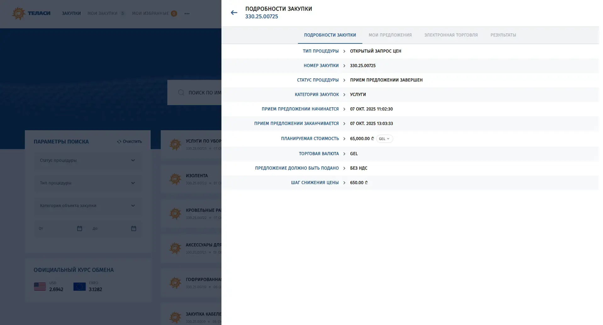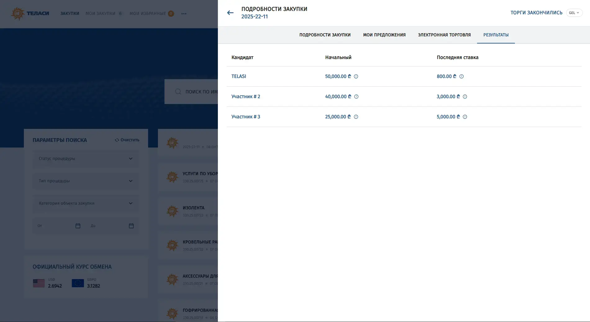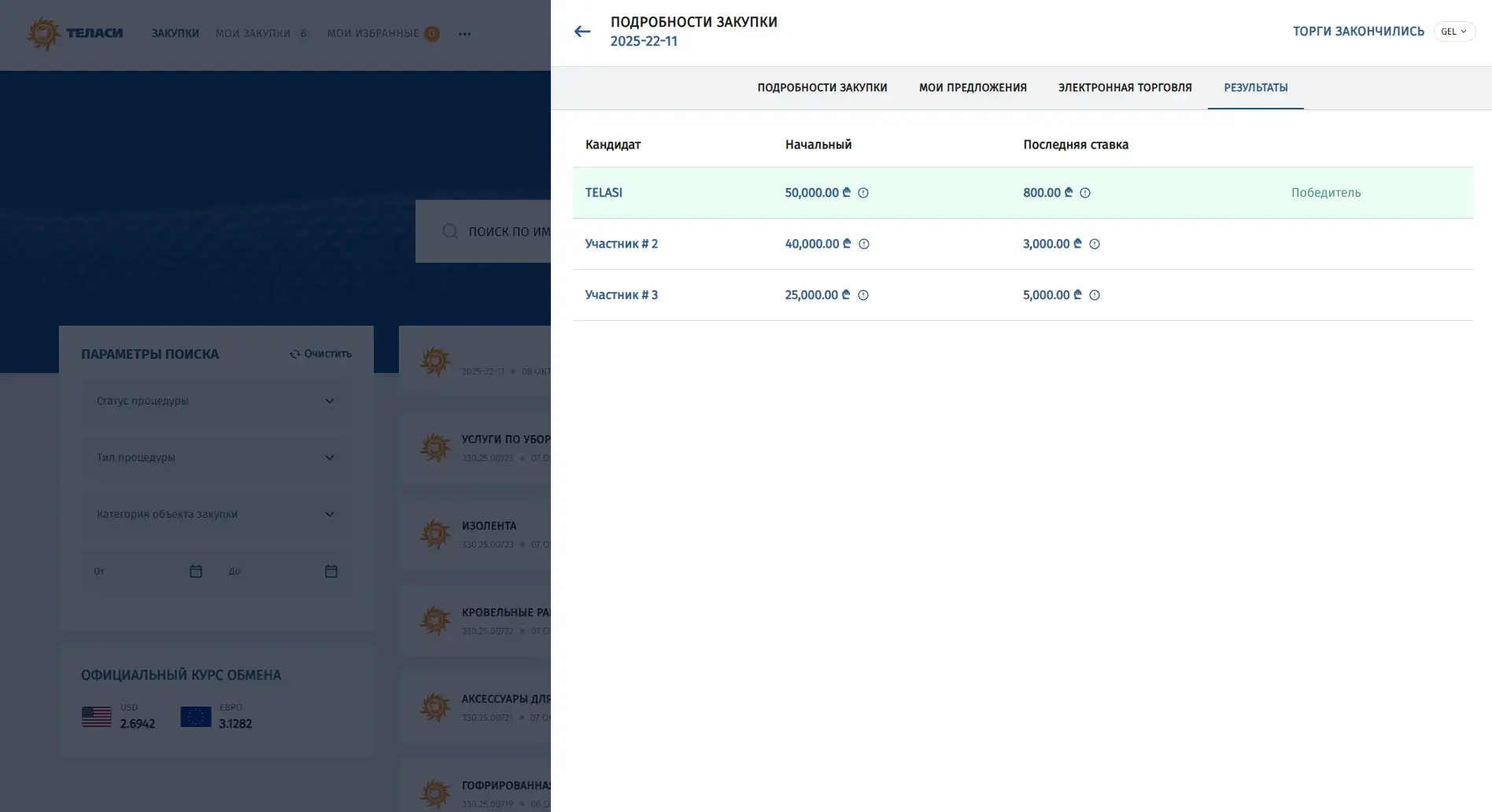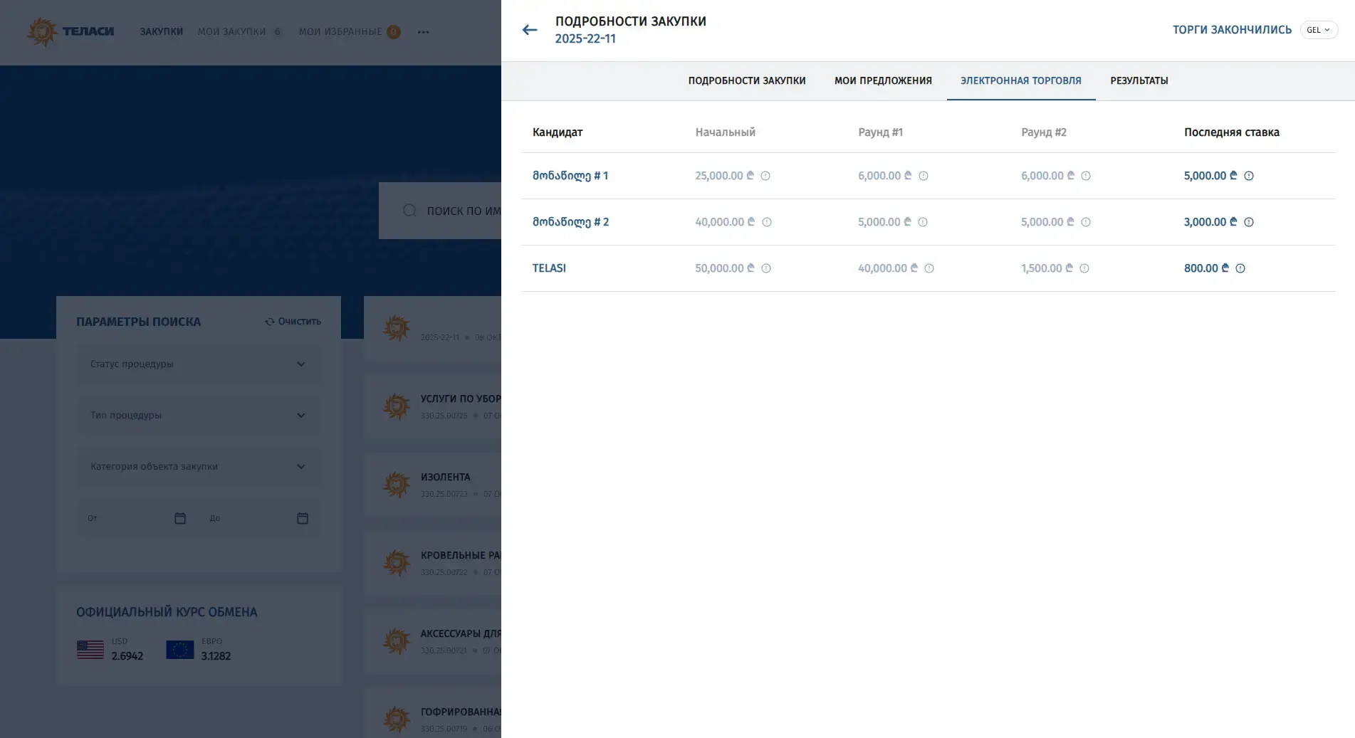 В электронной системе закупок АО «Теласи» размещены все регламентированные процедуры, объявленные организацией.
